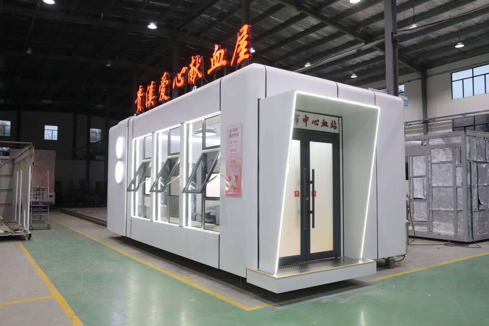無償獻(xiàn)血讓愛傳遞,移動獻(xiàn)血屋有30幾平方米??梢耘鋫銵CD廣告顯示屏,用于播放日常的愛心獻(xiàn)血宣傳廣告。然后做了一個(gè)大大的愛心造型,三層中空的鋼化玻璃的整個(gè)采光透光性是非常好的。它是屬于鏡面玻璃,外面看不到里面,從里面可以看到外面,可以起到一個(gè)很好的隱私保護(hù)作用。獻(xiàn)血屋的外墻采用全鋁材質(zhì),大門是雙拉門配備指紋密碼鎖。外觀設(shè)計(jì)簡潔大方的,色調(diào)為暖色調(diào)紅色白色為主。進(jìn)門的是前臺區(qū)域,用于正常的登記,體檢臺、化驗(yàn)臺、等候區(qū)、采血區(qū)、休息區(qū)。還有更衣室,可以供獻(xiàn)血人員和醫(yī)護(hù)人員更換衣服。洗手池,柜子可以放微波爐、咖啡機(jī)等。有沙發(fā)可以供獻(xiàn)血者來休息,采血區(qū)域配備了采血臺、采血椅熱合臺。還有儲存血液的冰箱。機(jī)采椅既可以坐也可以躺著采血。還可以上下調(diào)節(jié)。坐起來非常的舒坦。大大提高采血人員的舒適度。還剩余的空間放置機(jī)采設(shè)備。儲存柜可以讓獻(xiàn)血者放私人用品。