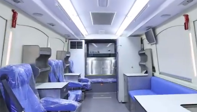 配置鋰電池系統(tǒng)的9米長的采血車,取消了傳統(tǒng)發(fā)動機的供電用鋰電池完全代替??梢詽M足一天8小時的采血工作需求,鋰電池放置在下面的行李艙里面。后面這個就是整個的一個電池塊。大概有60度的電。內(nèi)飾進行了升級,包括它的風道,頂棚,包層柱都做了一個商務改造。車廂的布局符合獻血流程。采血區(qū)域一共有四個采血位,可以四個人同時采血。旁邊是登記跟初篩的工作臺。負責給采血的人進行登記。檢測血型,做簡單的初篩。